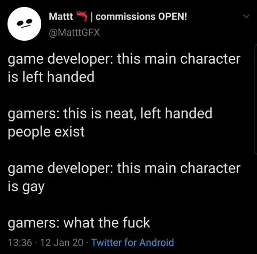 I hope, this way of thought would become more popular asap, so the studios would finally realise that they should pay the fucking scenarists and let them just do their job, instead of coming up with stupid requests amid the working process about making character be x, no matter how much it breaks the initial idea, making a piece of media into some kind of caricature, misrepresenting both lgbtq+ and the talent of a given scenarist, making just a mediocre product for the first, while also polarizing bigots even more, cuz obviously, “this game sucks cuz they spent all ihe money on them damn gays”.