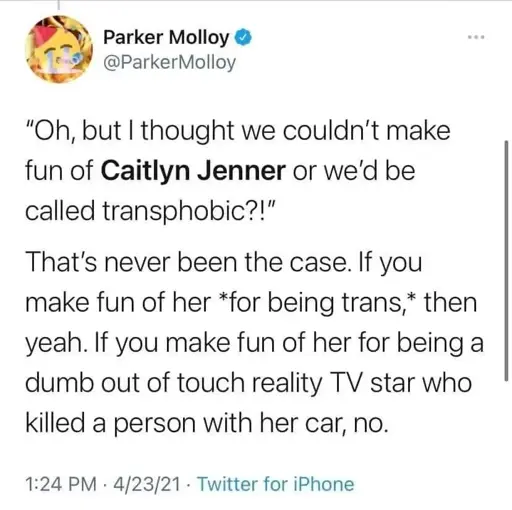 I’m just wondering how it would work here. One perspective I was thinking about was what you mentioned, how there’s no way to joke about her appearance without it being transphobic