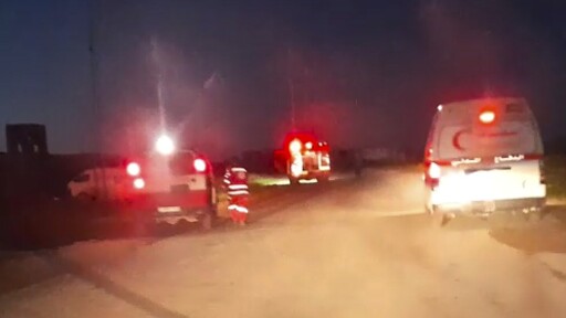 The footage shows the Red Crescent and Civil Defense teams driving slowly with their emergency vehicles’ lights flashing, logos visible, as they pulled up to help an ambulance that had come under fire earlier. The teams do not appear to be acting unusually or in a threatening manner as three medics emerge and head toward the stricken ambulance.